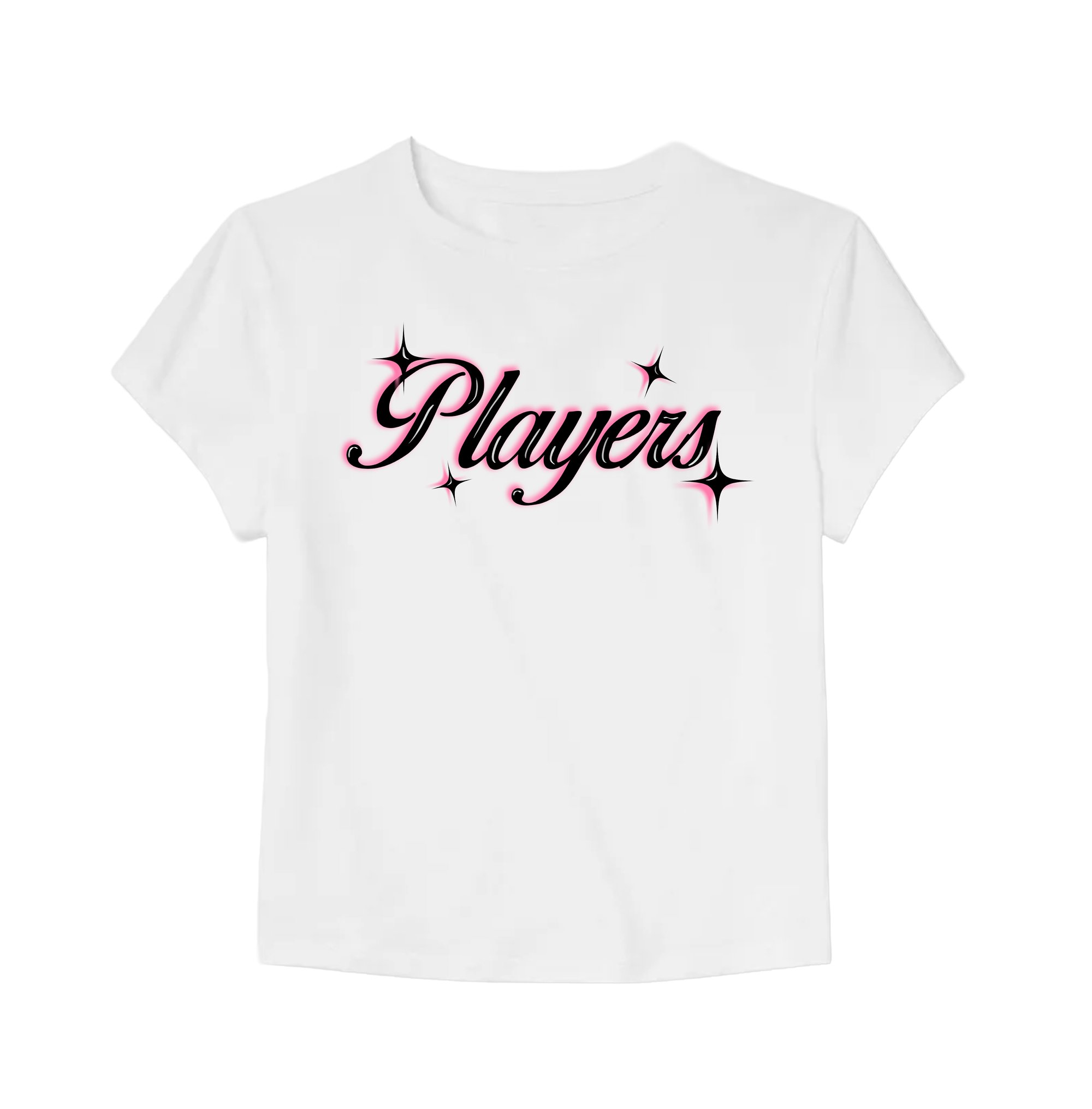 DTF logo on front Short-sleeve tee Cropped length Soft fabric blend with stretch Crewneck style Solid hue 95% cotton and 5% spandex